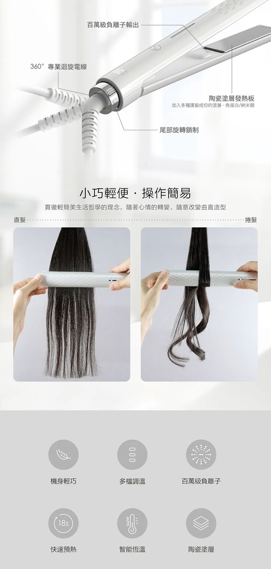 發熱板加入多種護髮成份的塗層 - 角蛋白,可令秀髮更柔順亮澤; 鈉米銀,可防靜電及異味