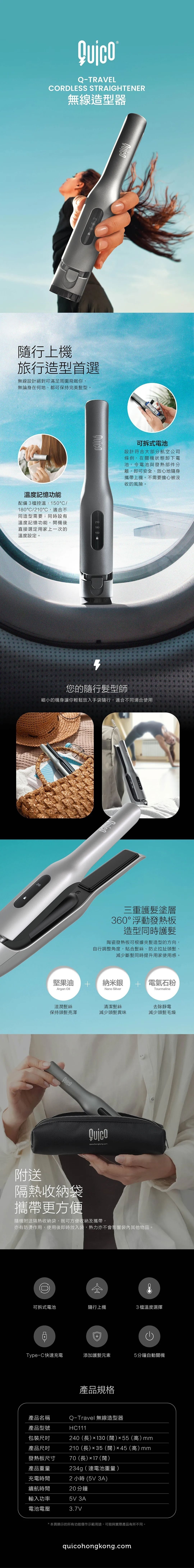 QUICO Q-Travel 無線造型夾,擺脫電線束縛,配備可拆電設計。這款便攜式旅行直髮夾符合絕大部分航空公司條例,只需在關機的狀態下就可以將電池卸下,輕鬆將電池與發熱部件分離,再放入手提行李。因此不需要擔心被沒收的風險,是可以安全、放心地隨身攜帶上機。