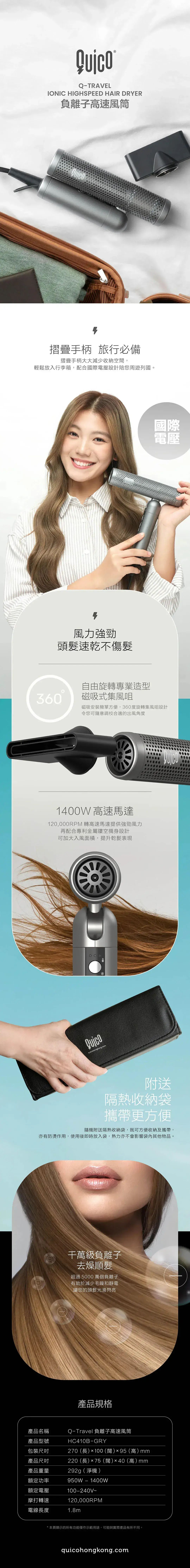 全新Quico Q-Travel負離子旅行護髮風筒專為熱愛探索世界的你而設。結合摺疊式機身與環球電壓設計,為你帶來優質旅行造型體驗: