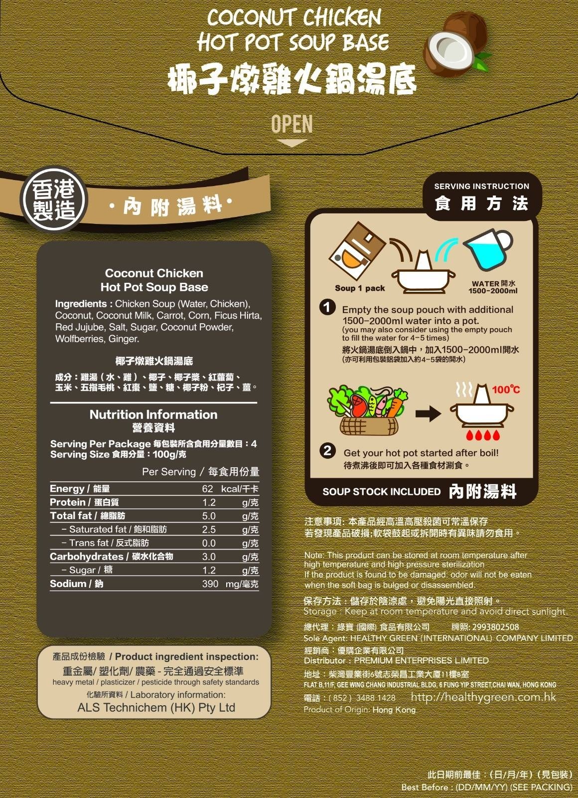 成份:雞湯(水, 雞), 椰子, 椰子槳, 紅蘿蔔, 玉米, 五指毛桃, 紅棗, 鹽, 糖, 椰子粉, 杞子, 薑。