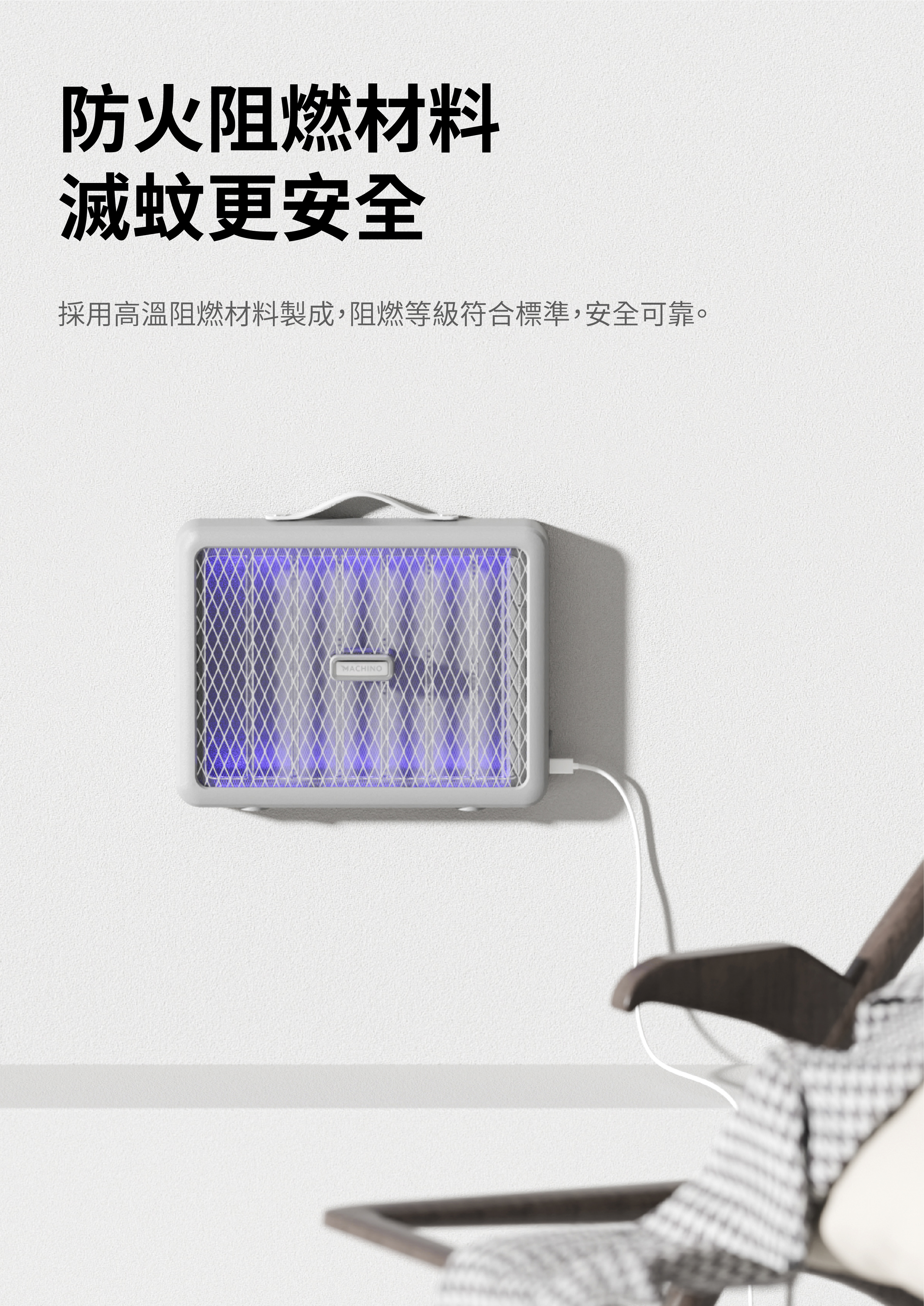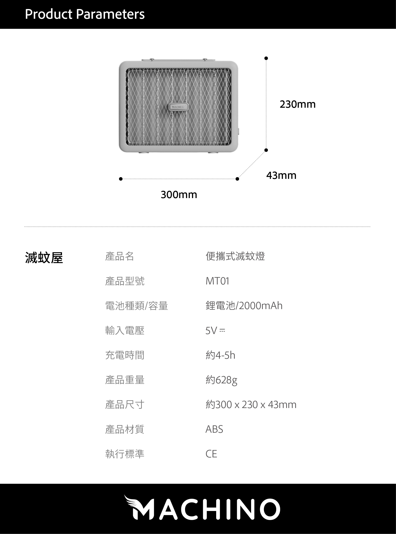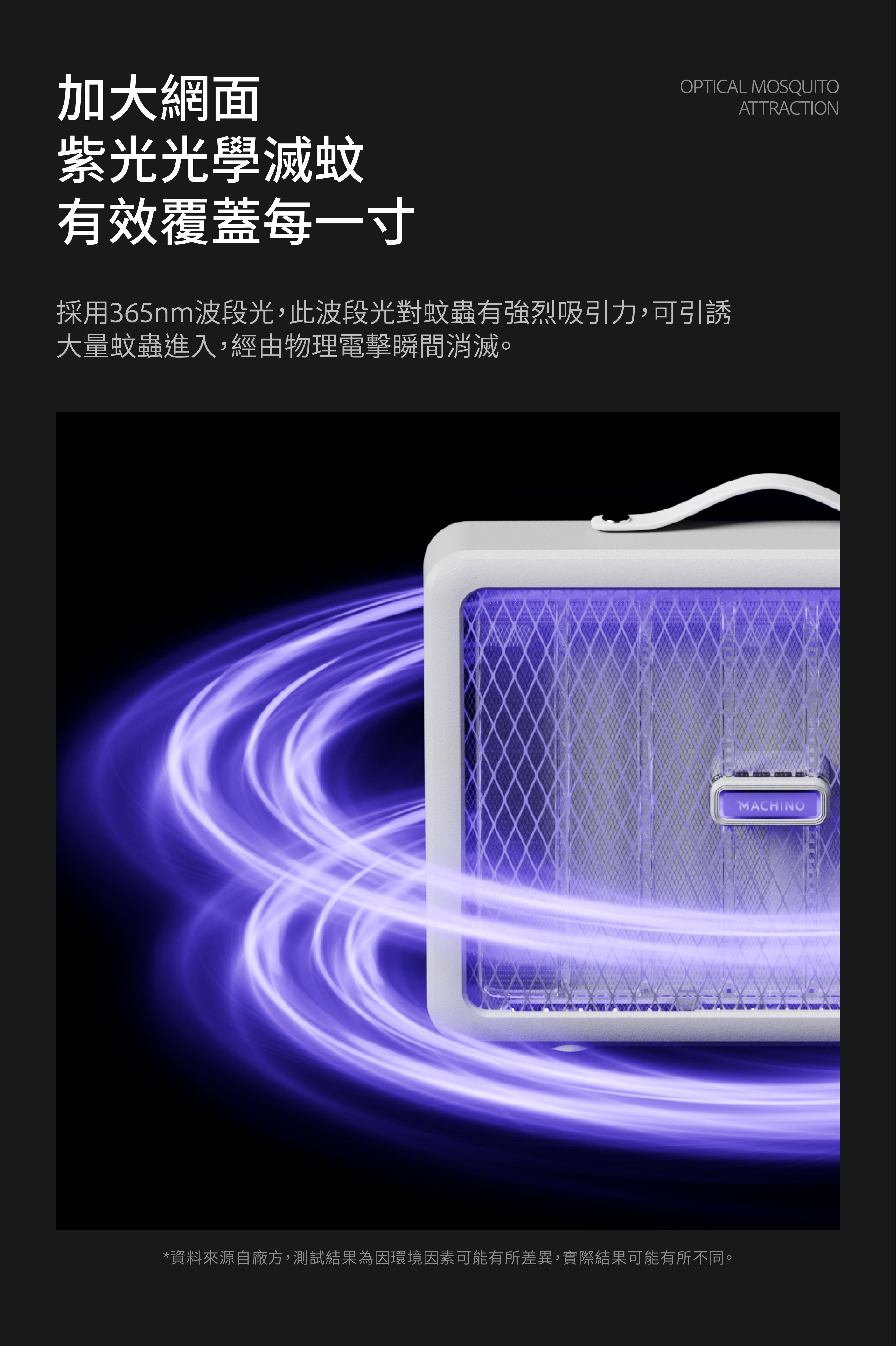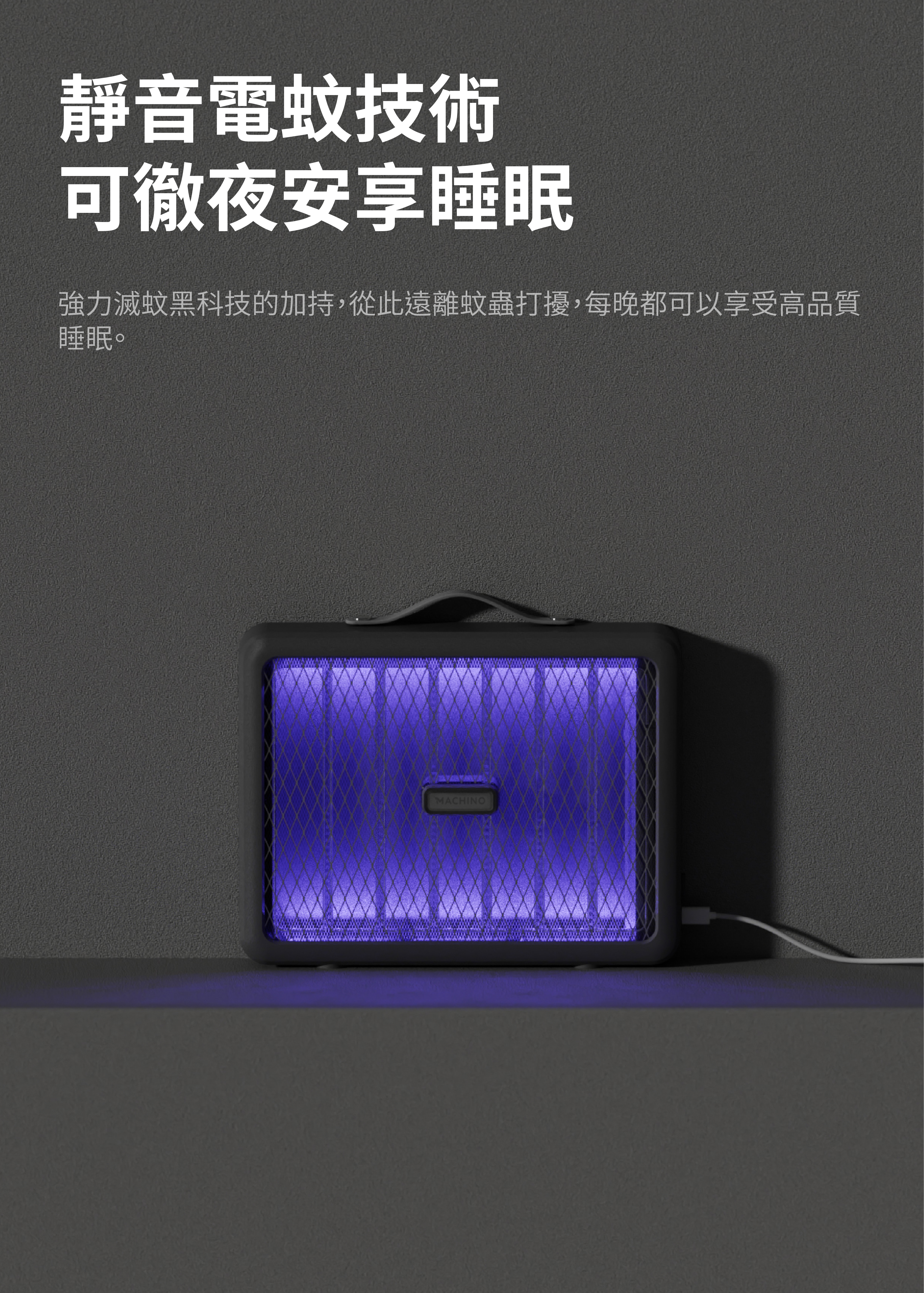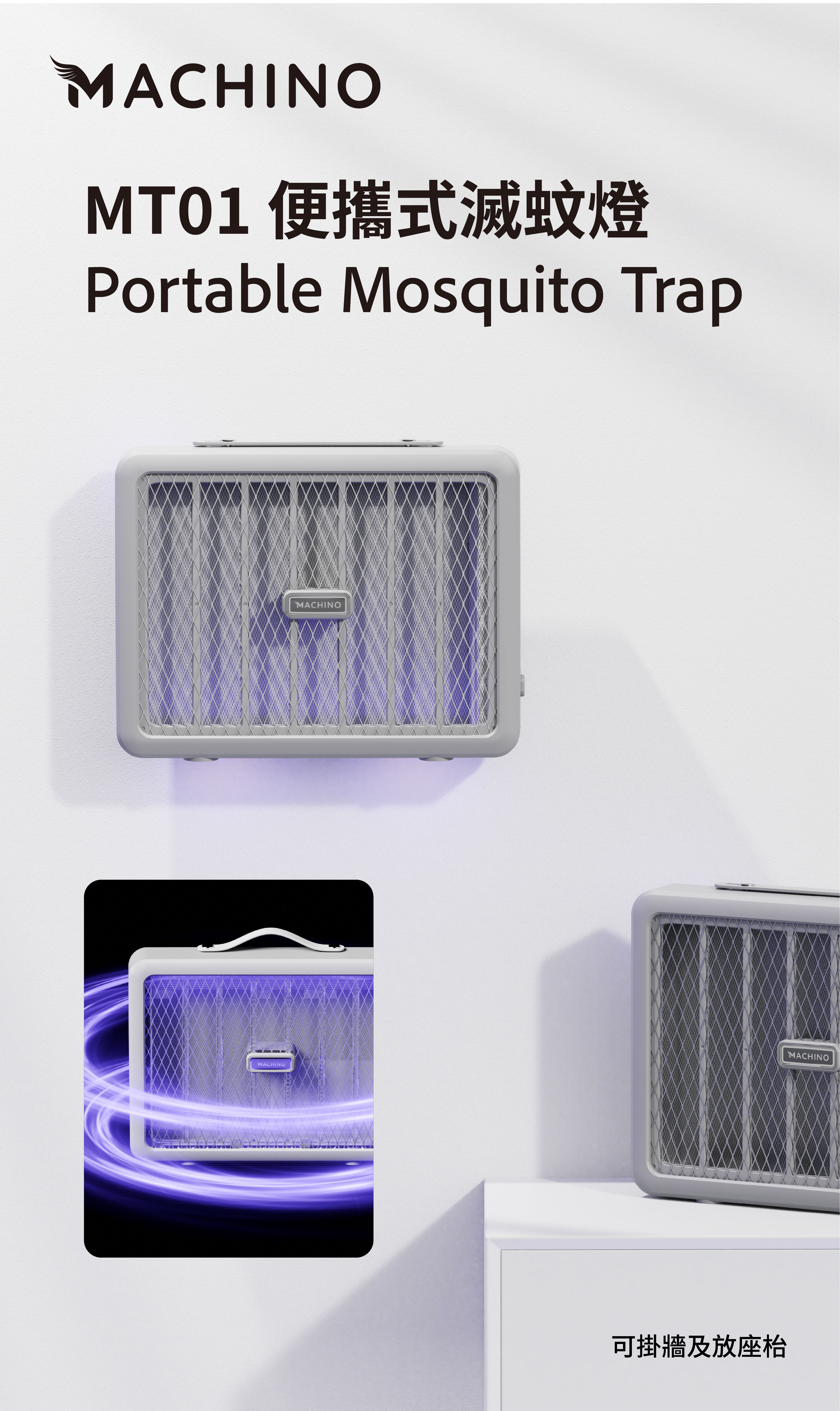 MACHINO 新推出MT01 滅蚊燈,加大滅蚊網面設計,仿如-塊流動大滅蚊拍,產品使用紫光變頻光波,針對不同種類蚊蠅趨光性,採365NM全波段變頻誘殺,只要蠅蚊靠近瞬間釋放2800v電壓擊斃。另產品內置電池,備有掛繩可掛壁使用,更可放房、廳或戶外,隨時隨地幫你滅蚊。