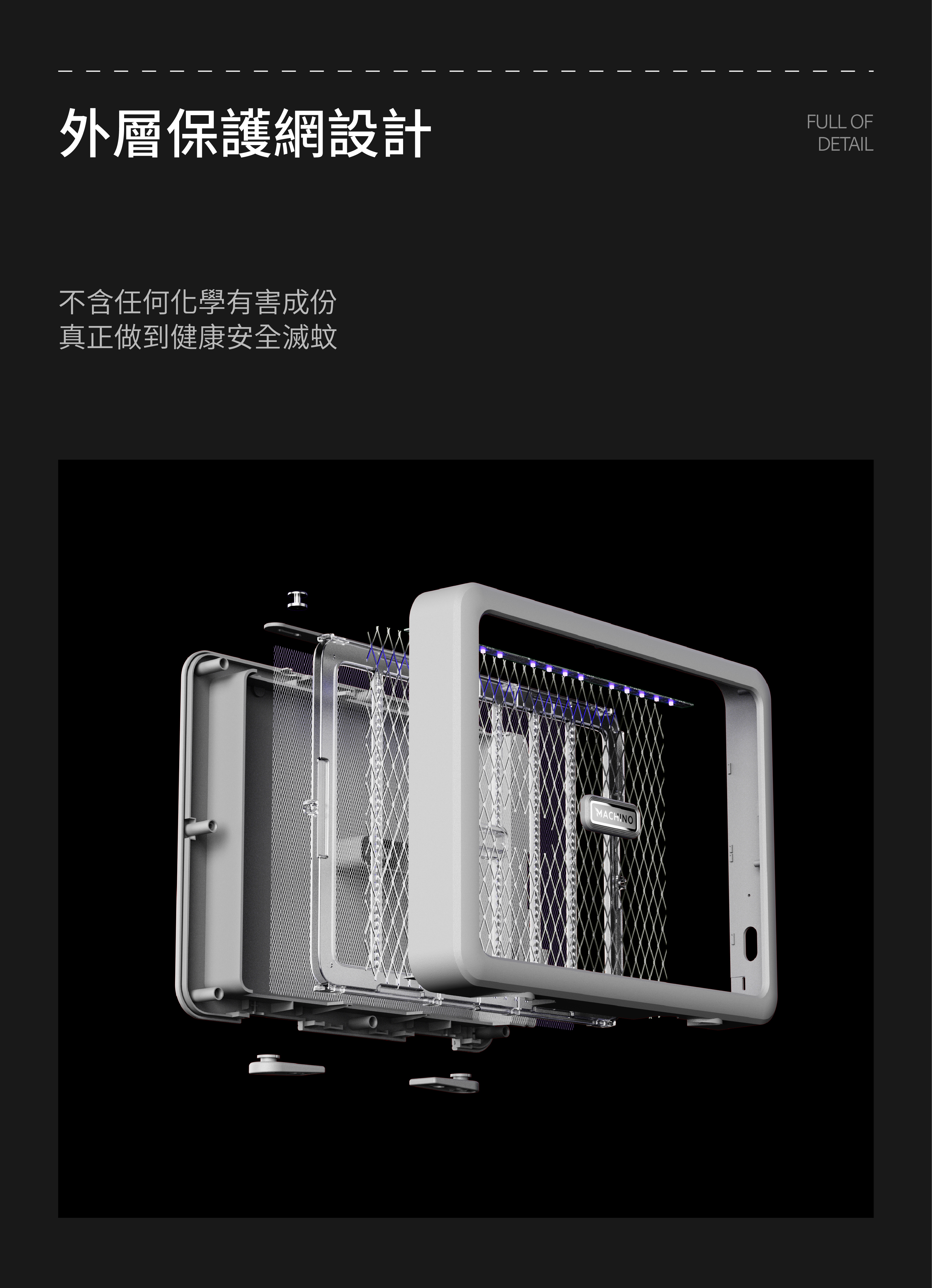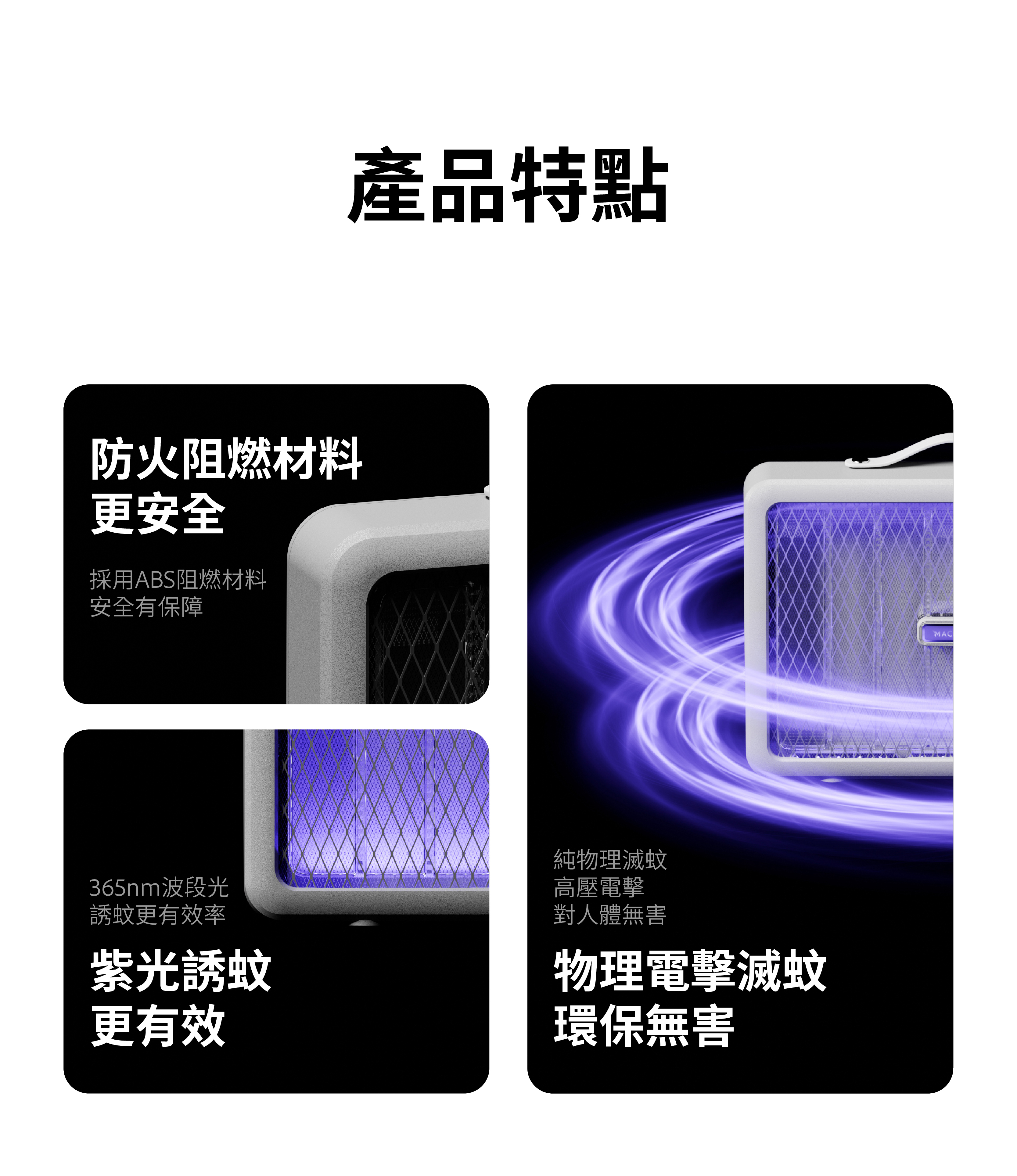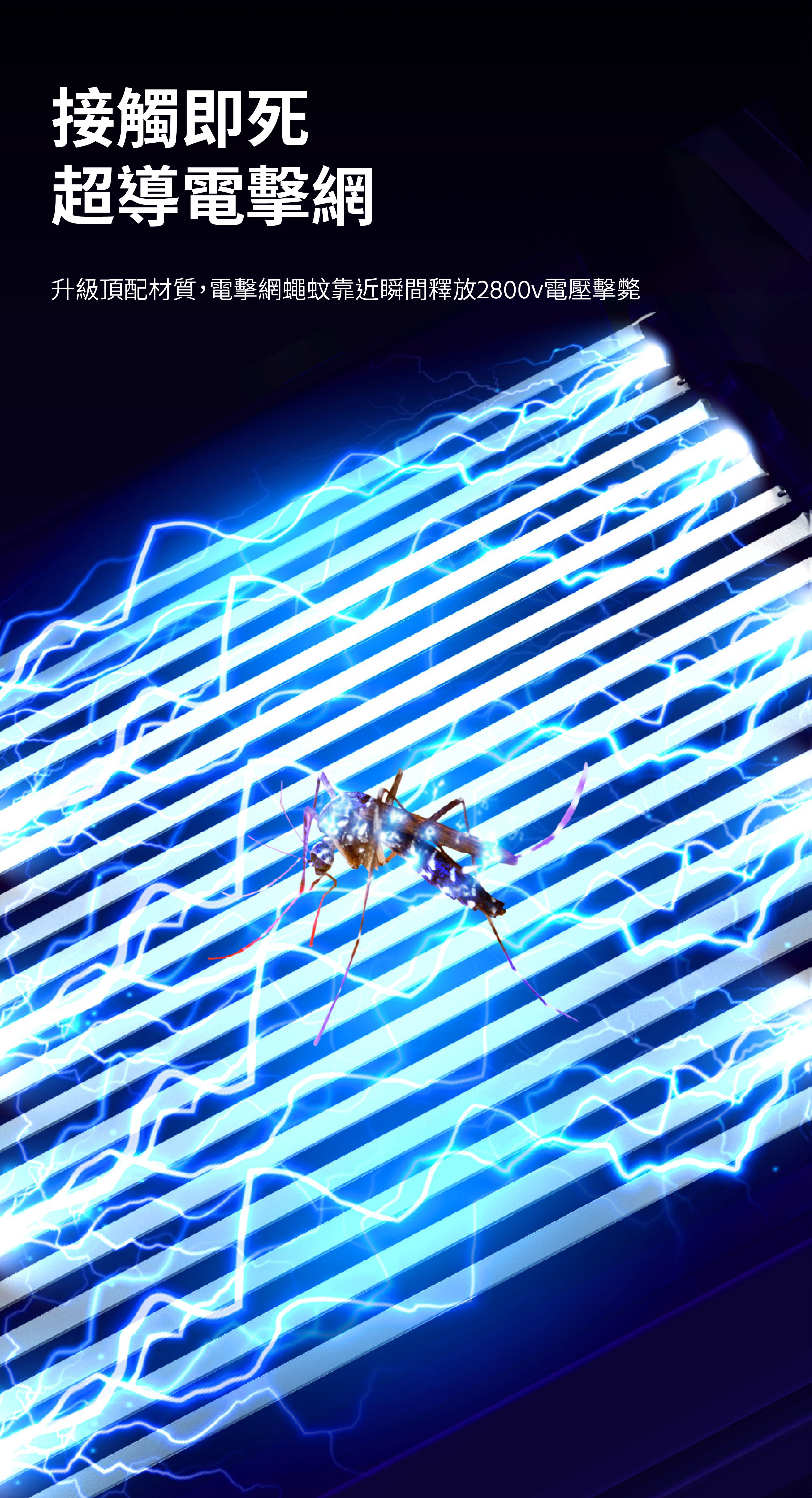 - 加大電擊網面積,蠅蚊靠近瞬間釋放2800v 電壓擊斃