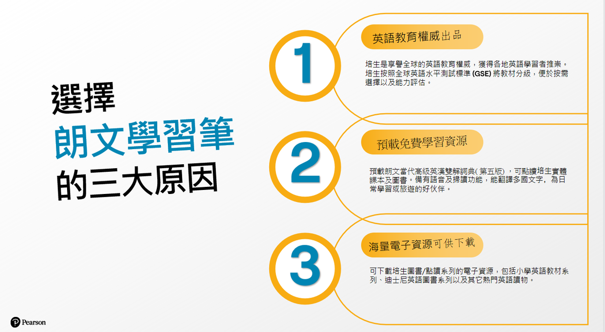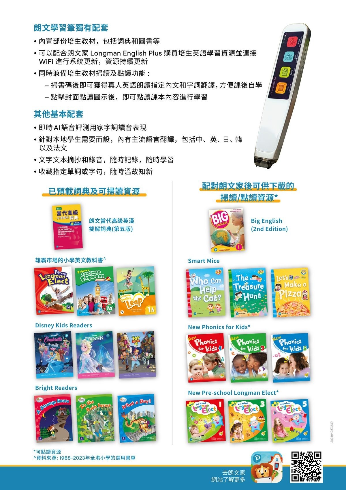 - 可以配合培生指定實體教科書/ 讀本(包括掃讀及點讀功能)以及朗文家互動英語自學程式一併使用