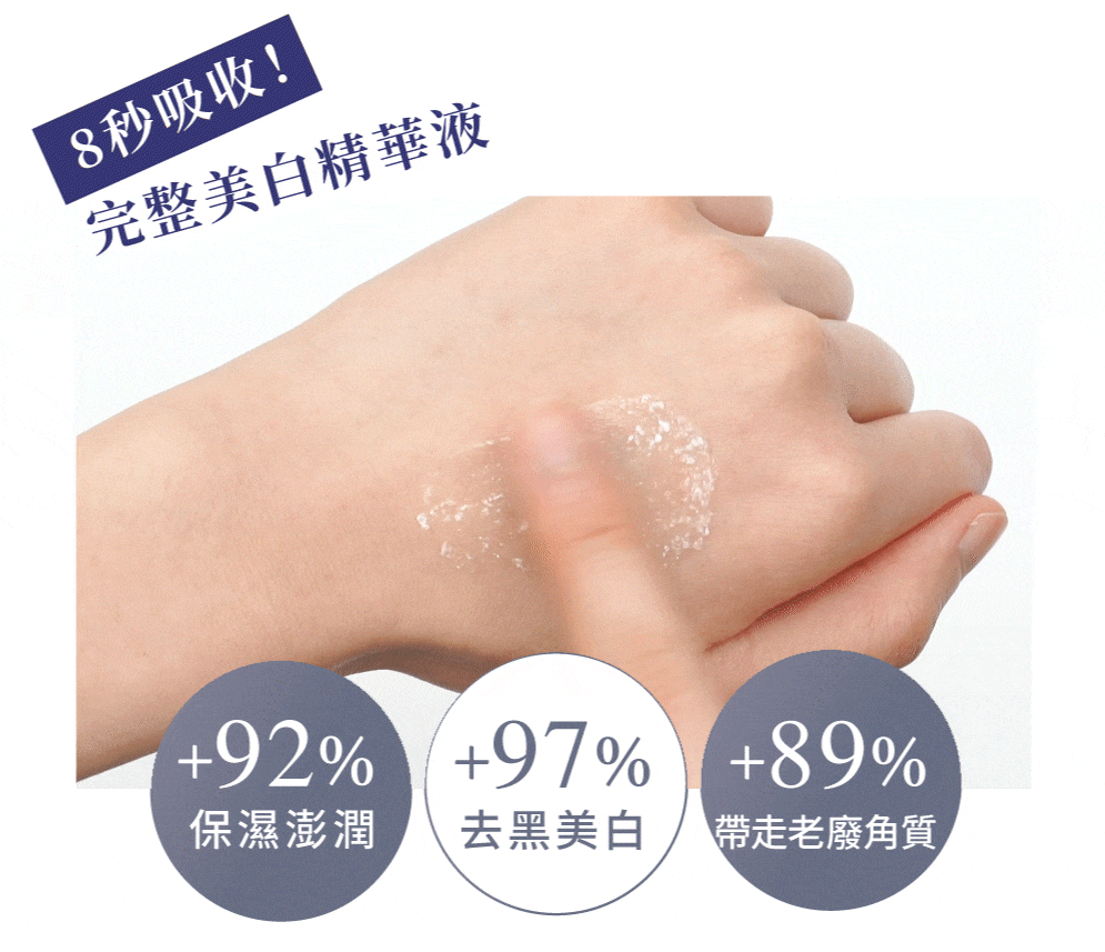 -21種美白精華成分,8秒快速吸收質感清爽
