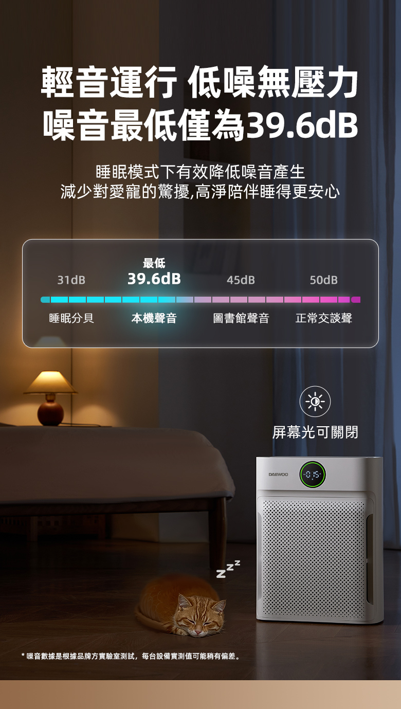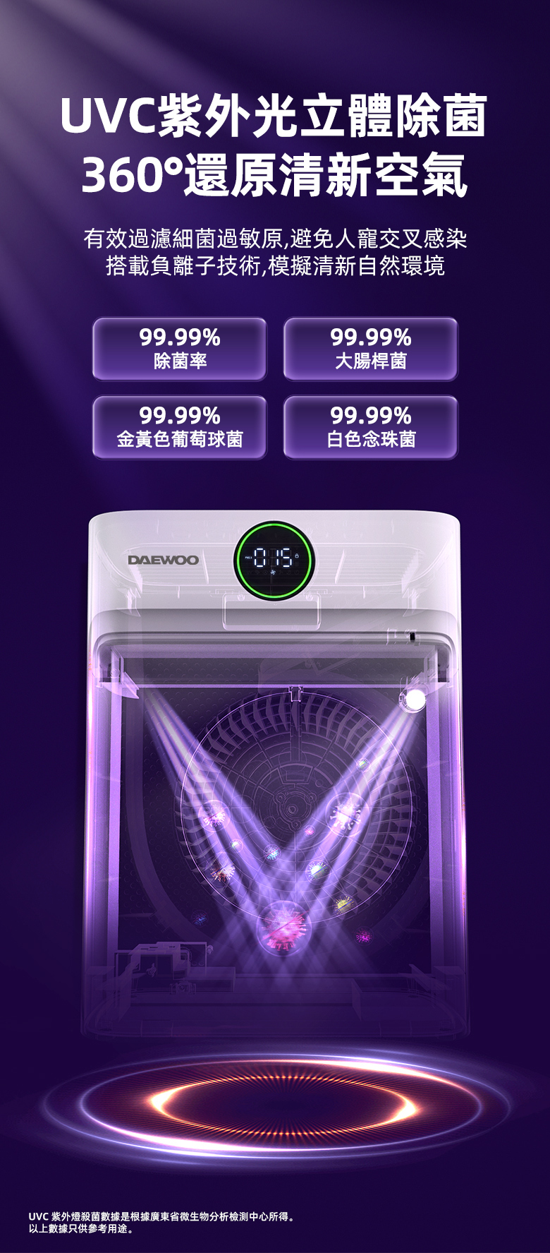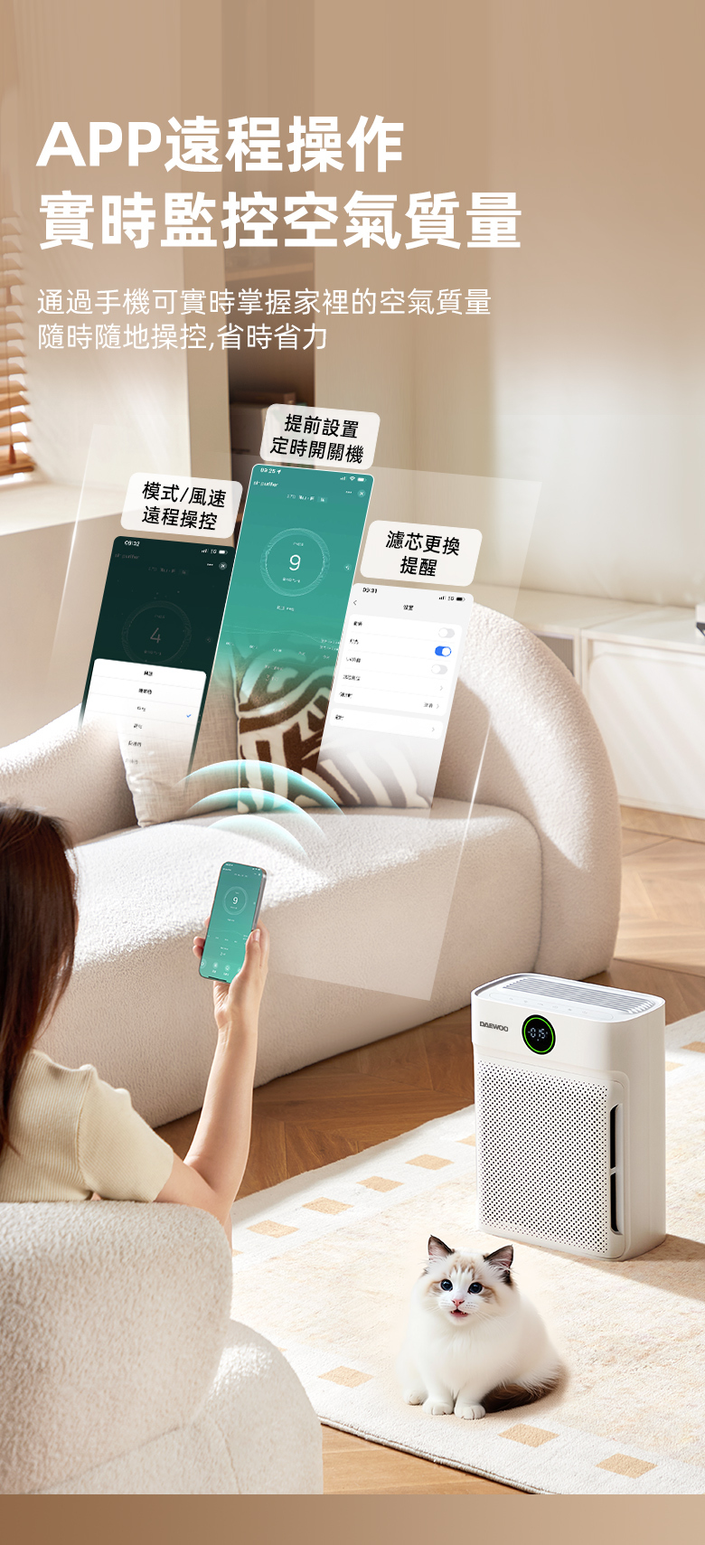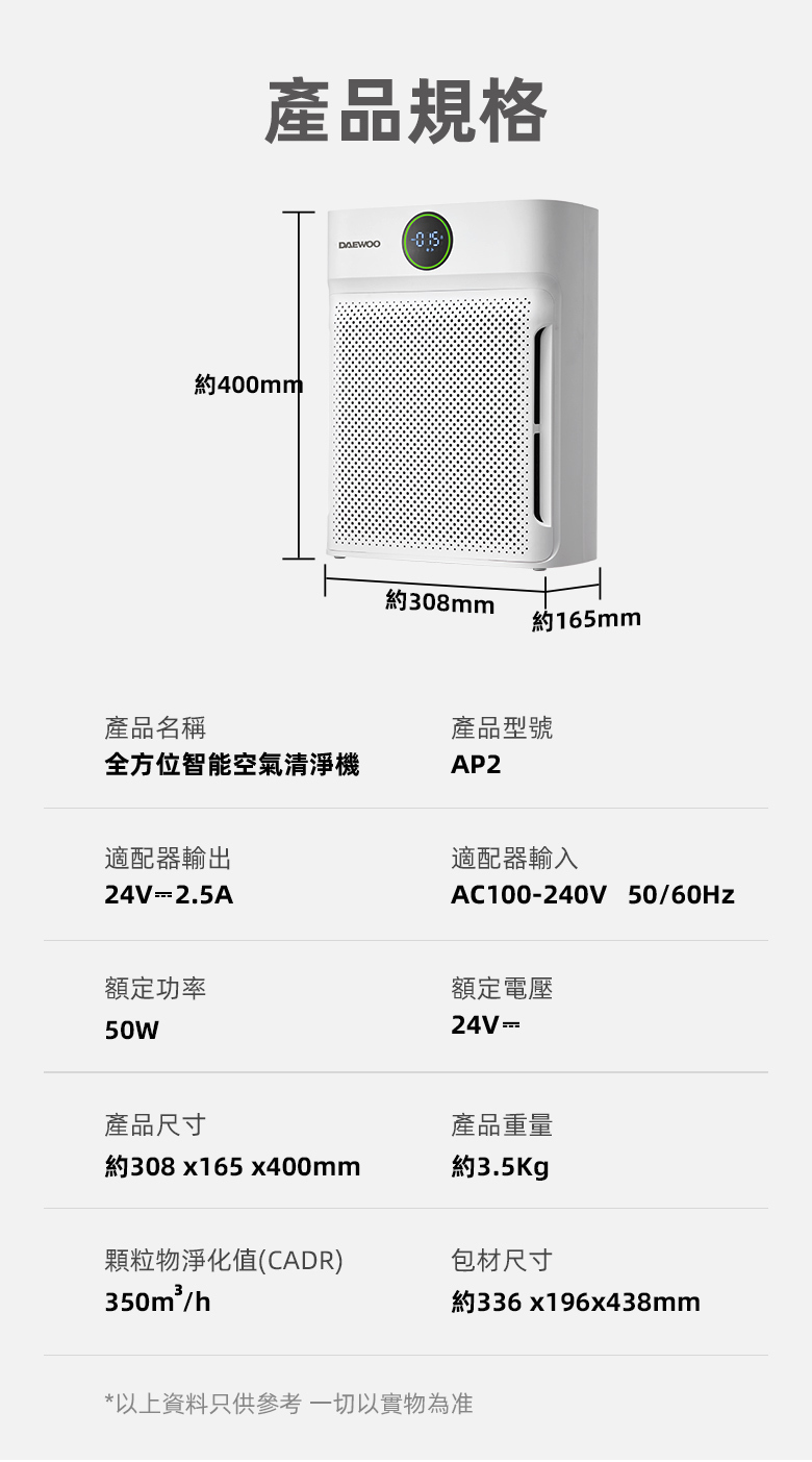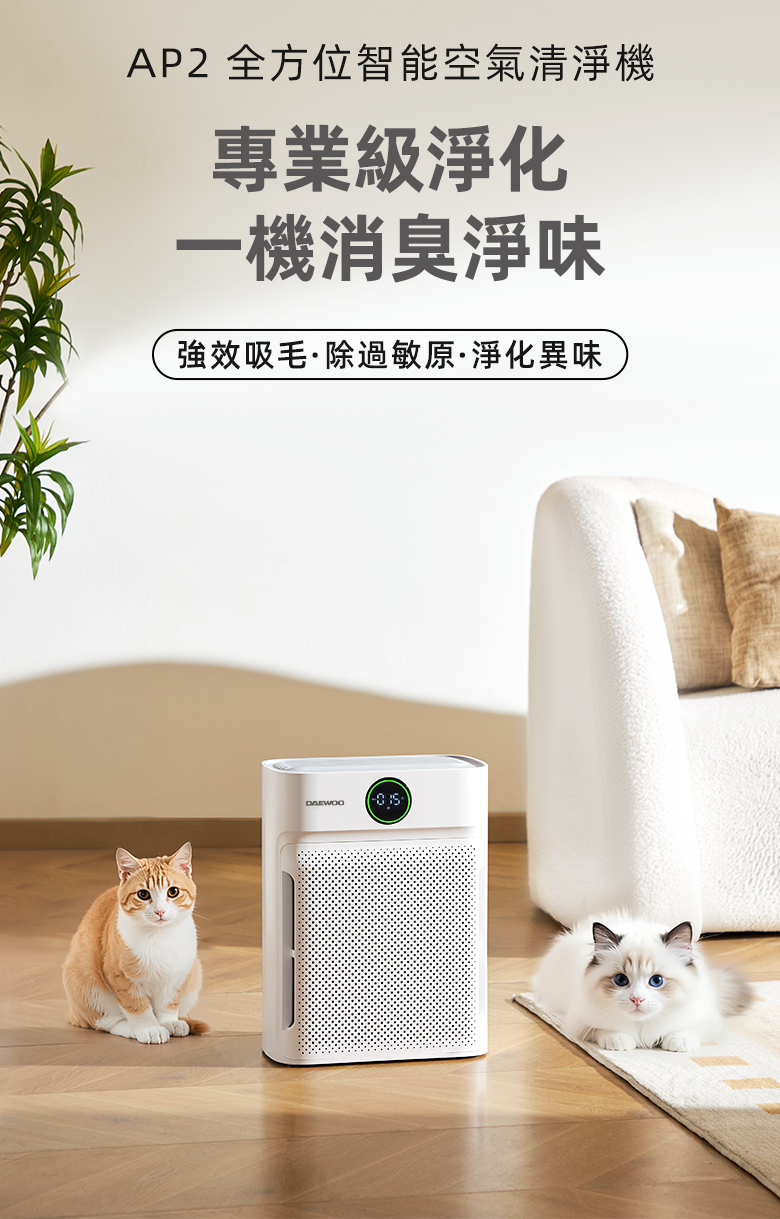 DAEWOO AP2全方位智能空氣清淨機,雙寬吸口加強勁CADR 350m³/h潔淨空氣輸出率,毛團病毒秒速清除!四合一漸進式濾網阻隔99.98%空氣微粒, 實測去除99%貓皮屑過敏原、99.99%貓杯狀病毒、99.99%鼠傷寒沙門氏菌!UVA/UVC雙紫外線99.99%高效殺菌,負離子沉降浮毛,實時監測PM2.5+APP遙控功能,1小時可換氣11.6次!三重安全防護+低至約39.6dB靜音,守護家人寵物睡眠