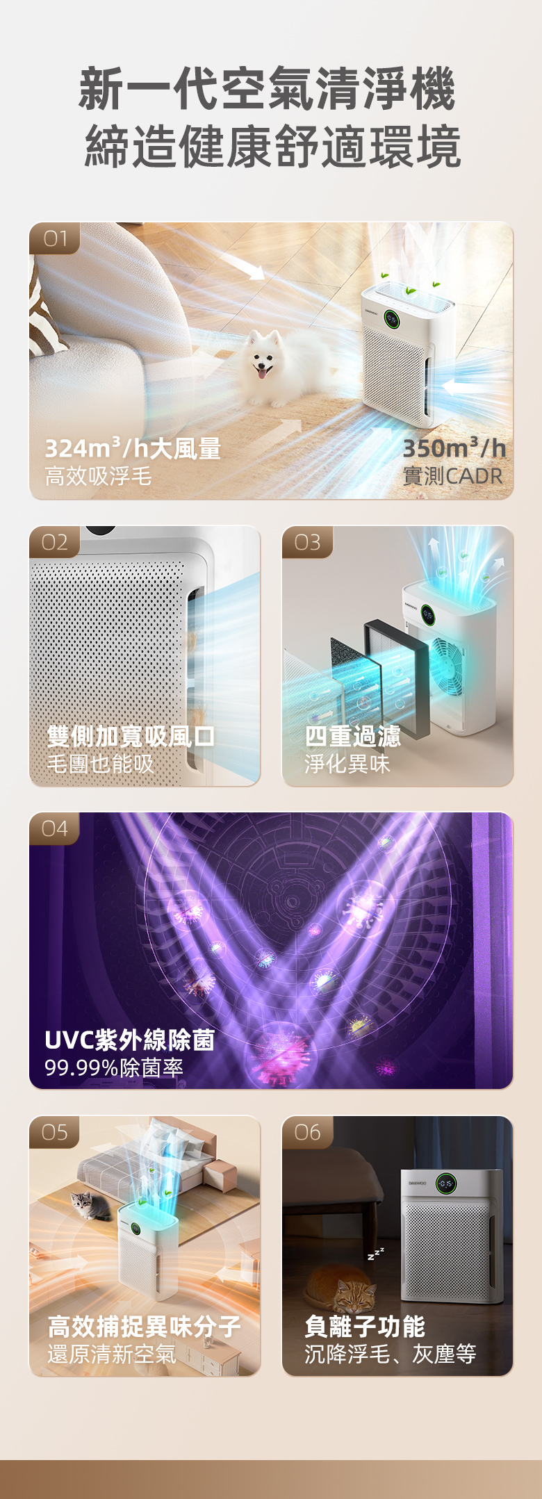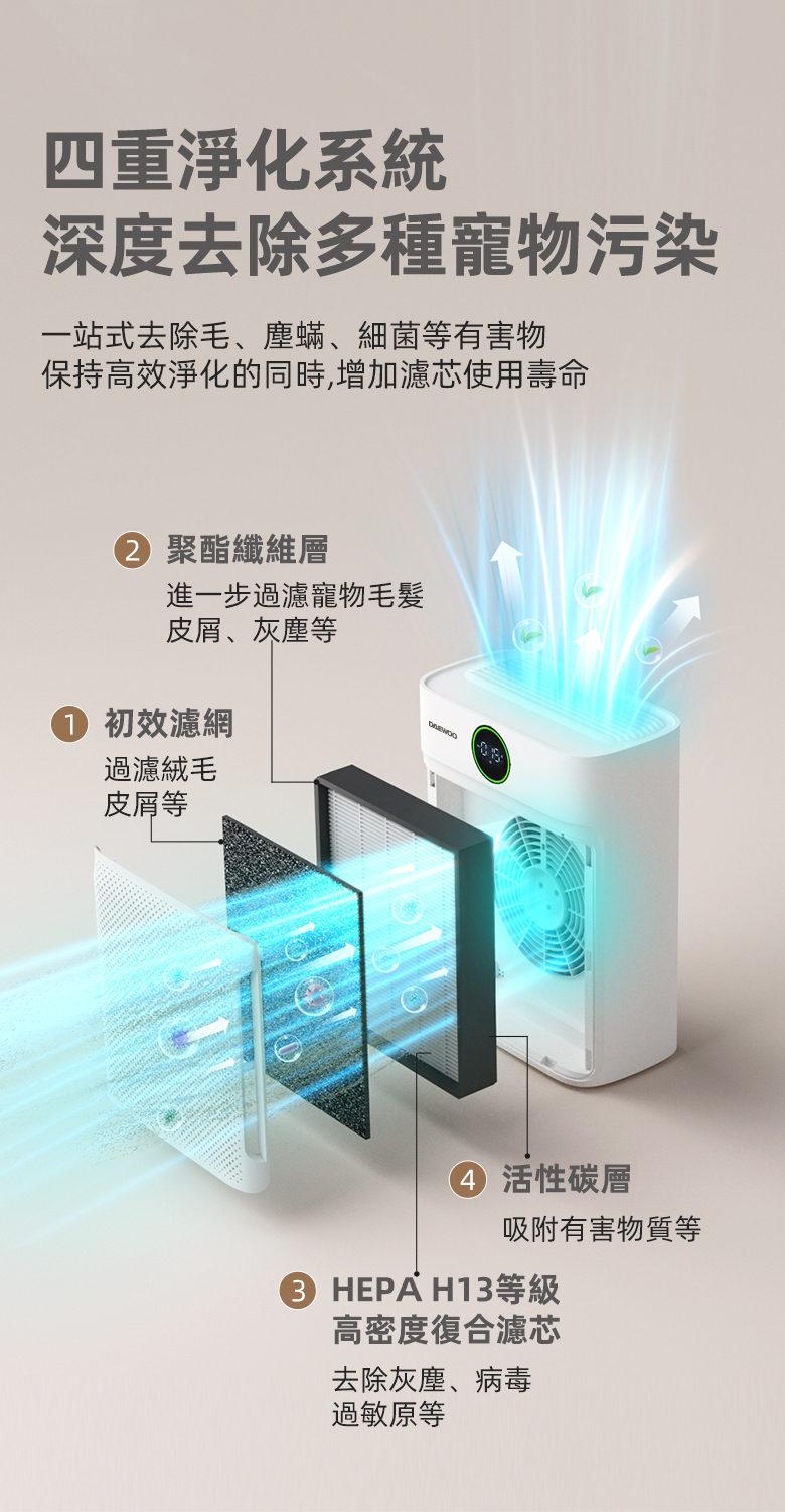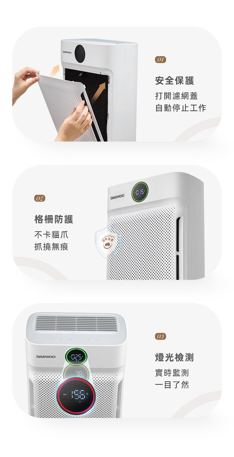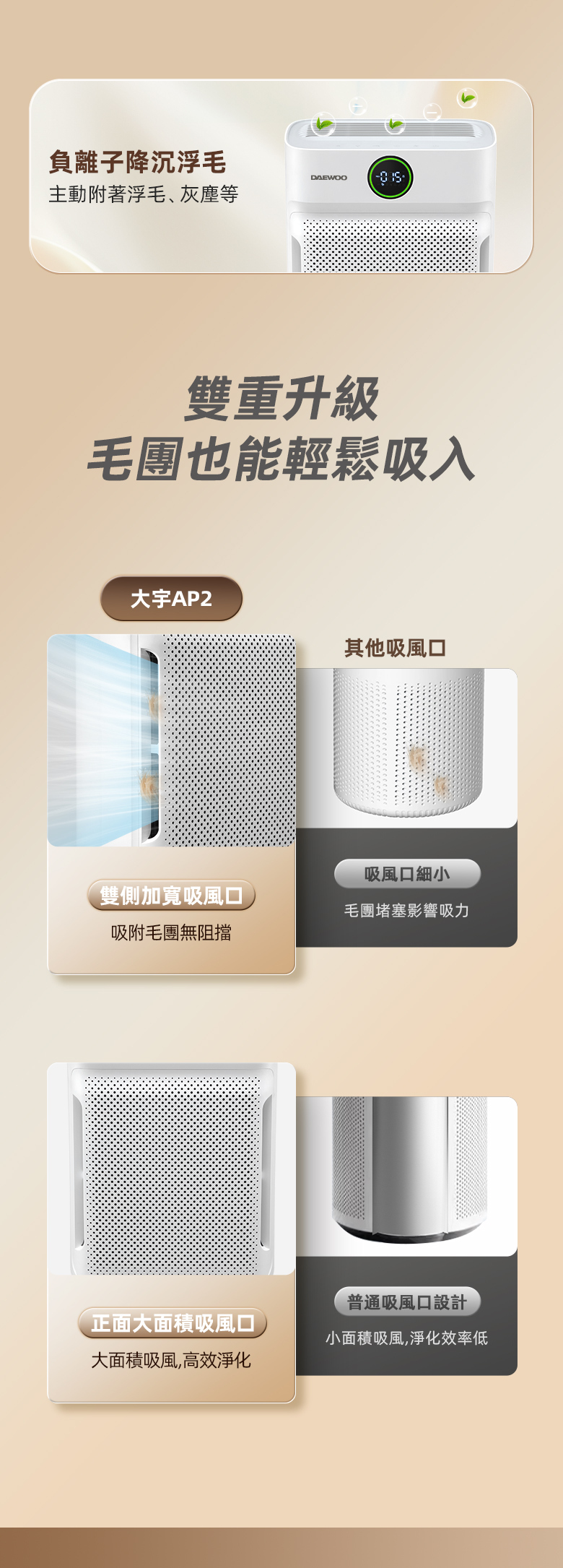 DAEWOO AP2全方位智能空氣清淨機,雙寬吸口加強勁CADR 350m³/h潔淨空氣輸出率,毛團病毒秒速清除!四合一漸進式濾網阻隔99.98%空氣微粒, 實測去除99%貓皮屑過敏原、99.99%貓杯狀病毒、99.99%鼠傷寒沙門氏菌!UVA/UVC雙紫外線99.99%高效殺菌,負離子沉降浮毛,實時監測PM2.5+APP遙控功能,1小時可換氣11.6次!三重安全防護+低至約39.6dB靜音,守護家人寵物睡眠