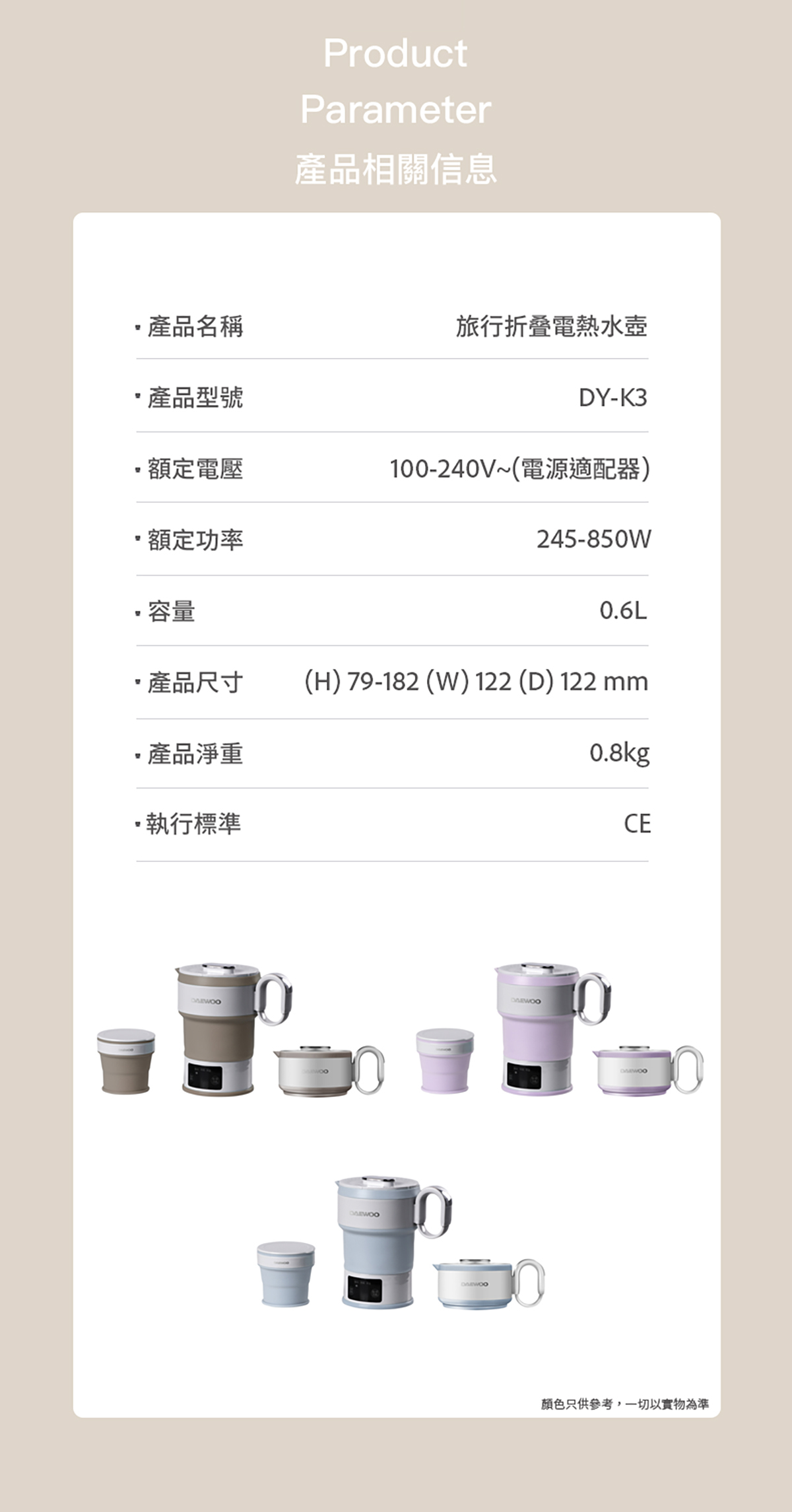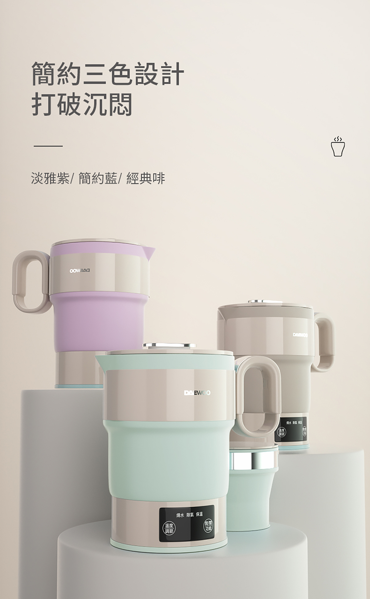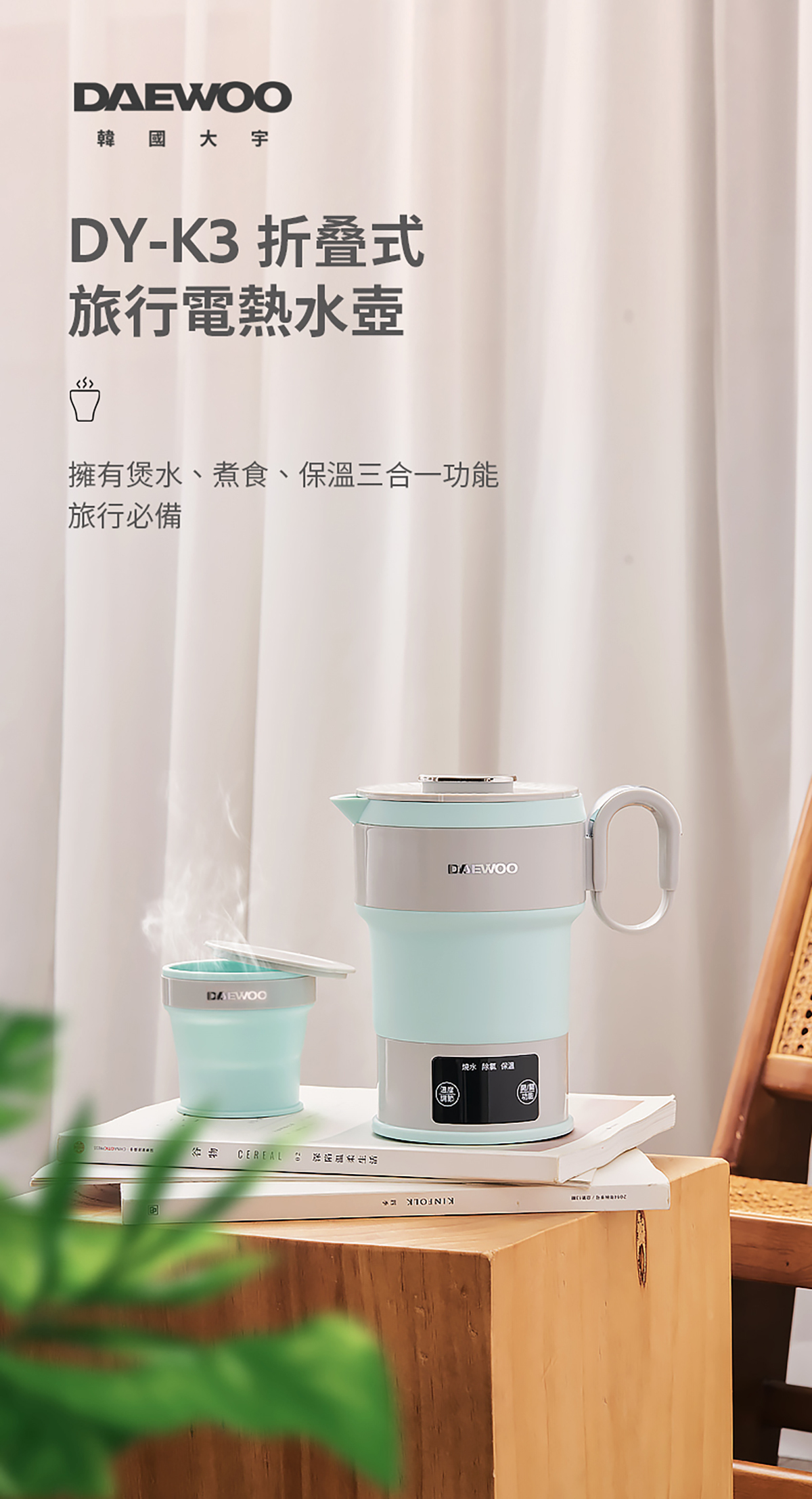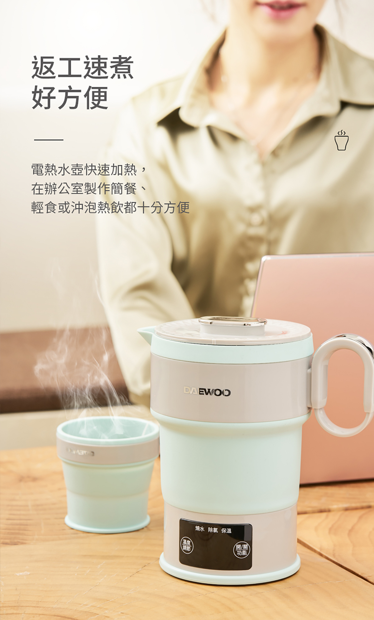 DAEWOO DY-K3 摺疊式旅行電熱水壺摺疊式設計,迷你輕巧便攜,貼心配備摺疊式旅行水杯。