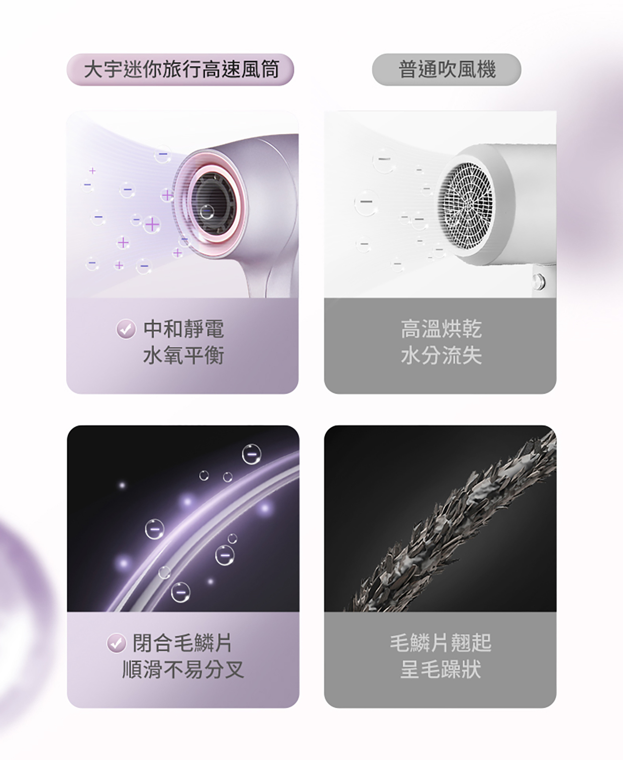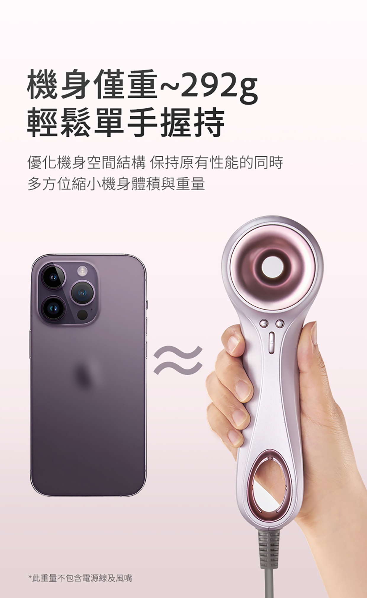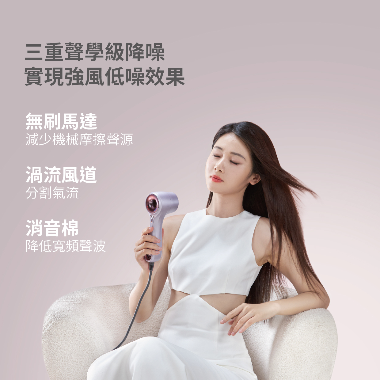 -高性能無刷馬達: 轉速高達 110,000RPM*,風力強勁,幫你快速吹乾頭髮。