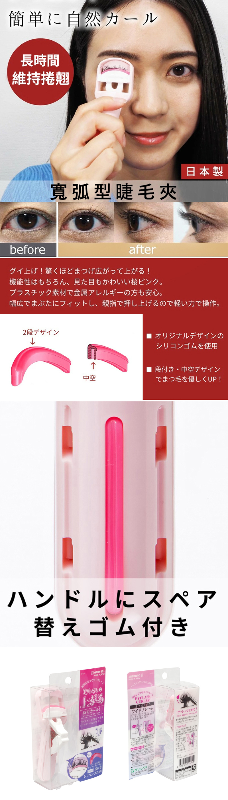 *專利設計的寬弧型,能夠自然捲翹且呈現扇形拓寬,讓睫毛長時間維持捲翹。