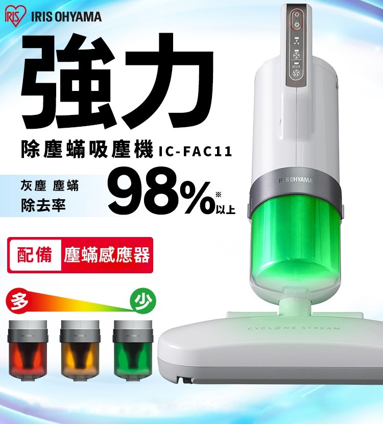 IRIS OHYAMA FAC11 (FAC3最新版) 除塵蟎吸塵機 輕量設計,1.6 KG 三色燈高敏感度的塵蟎感應器,每分鐘拍打約7000次與暖風功能來降低室內濕度,降低塵蟎生成 「雙重過濾」及「可水洗」式設計使用「可水洗式」集塵袋將拍打出的蟎蟲和有害健康的致敏原清除。