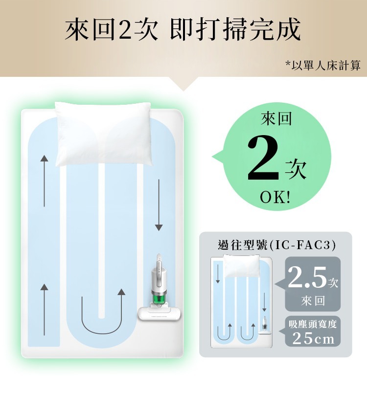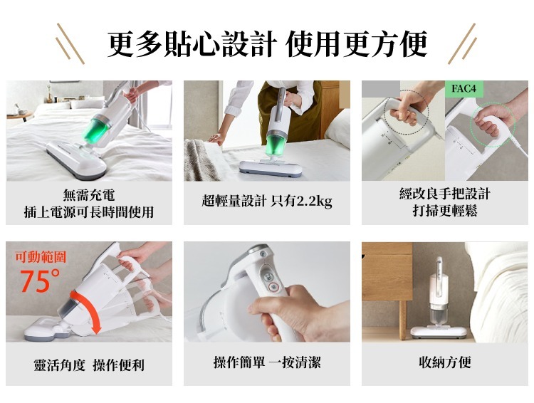 - 每分鐘拍打約14,000次,將隱藏的塵蟎拍打至床鋪表面