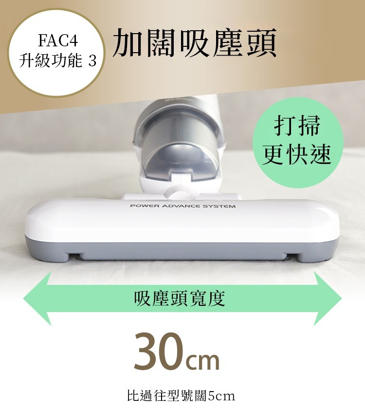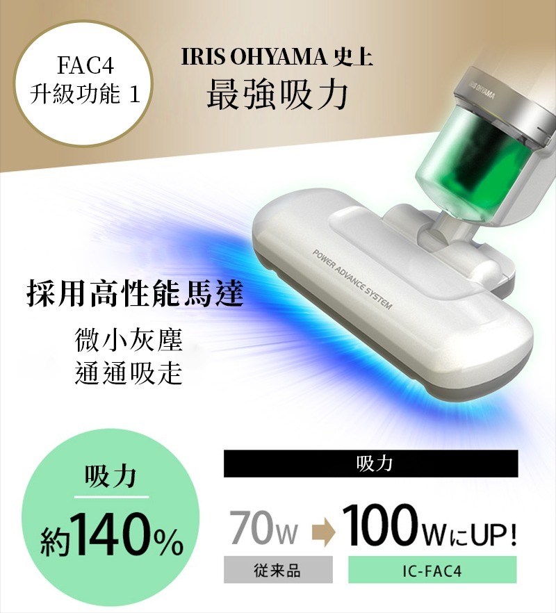 IRIS OHYAMA FAC4 吸塵機 史上吸力最強除塵蟎吸塵機! 加大功率令吸力大大提升,每分鐘拍打次數增至約14,000次, 令潛藏於床舖的塵蟎及灰塵無所遁形,吸頭加寬 5cm 令打掃更省時。