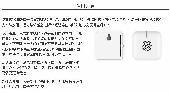 - 流動及家用驅蚊器使用了Radarcan的專有INSonuerit1.0技術,它發出全方位發射的超聲波,當碰到硬物會回彈及折 射到其它地方,並影響昆蟲的感觀系統。藉此固定他們不去咬我們或驅除他們離開防護範圍。