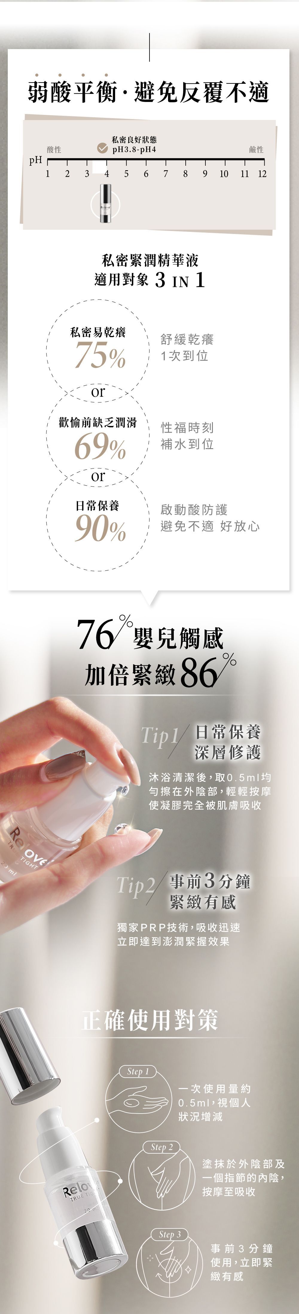 建議沐浴清潔後,取0.5ml均勻擦在外陰部,輕輕按摩,直至凝膠完全被肌膚吸收,根據個人情況,可酌量增加用量,恩愛前三分鐘輕輕按摩效果更佳。