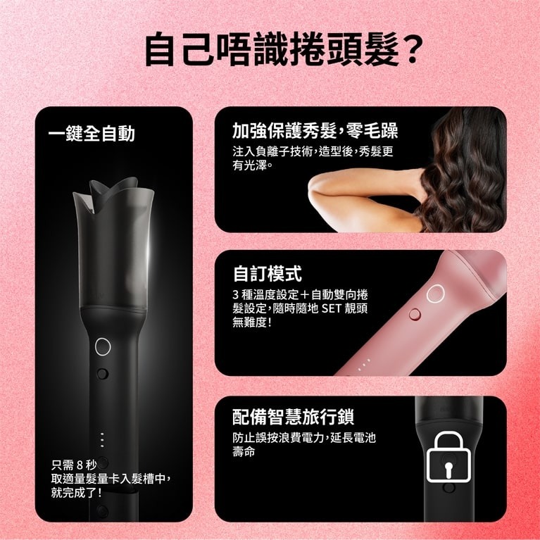 只需一按,全自動捲髮筒 8 秒即可打造持久、零毛躁捲髮造型,輕鬆掌控,適用於所有髮質。隨時隨地 SET 靚頭無難度!