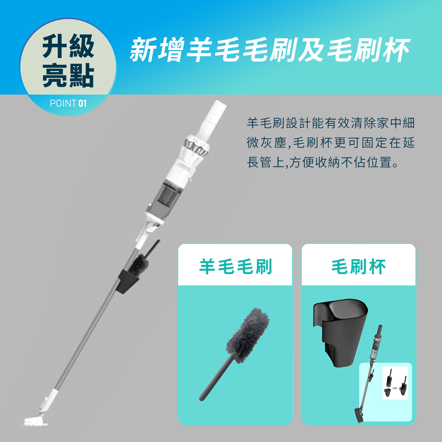 •新增羊毛毛刷及毛刷杯:羊毛刷設計能有效清除家中細微灰塵,毛刷杯更可固定在延長管上,方便收納不佔位置。